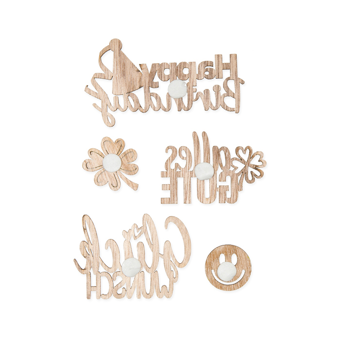 mit Klebepunkt auf der Rückseite / 3 Schriftzüge, 1 Glücksklee, 1 Smiley